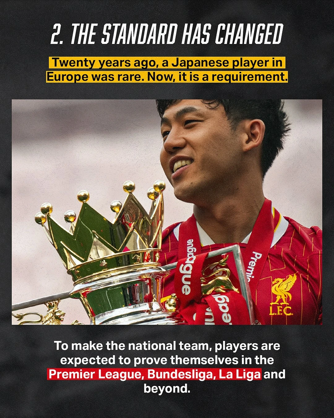 두 번째는 '기준의 변화'다. 20년 전만 해도 일본 선수가 유럽에서 뛴다는 것 자체가 뉴스였지만 이제는 국가대표가 되기 위해 오히려 유럽에서 자신을 증명하는 것이 당연한 조건처럼 여겨진다는 내용이다.