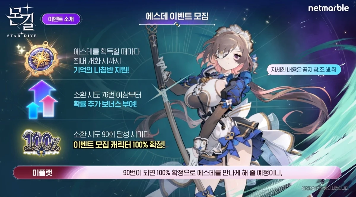 출시 후 첫 번째 이벤트 모집 캐릭터는 ‘메이드와 토끼풀 여관’의 간판 메이드 ‘에스데’로 확정됐다. 최대 개화 단계까지 ‘에스데’를 소환할 때마다 ‘기억의 나침반’을 10개씩 추가 제공하며, 소환 시도 76회부터는 확률 추가 보너스가 적용된다. 또한 90회 달성 시 ‘에스데’를 100% 확정 획득할 수 있다.