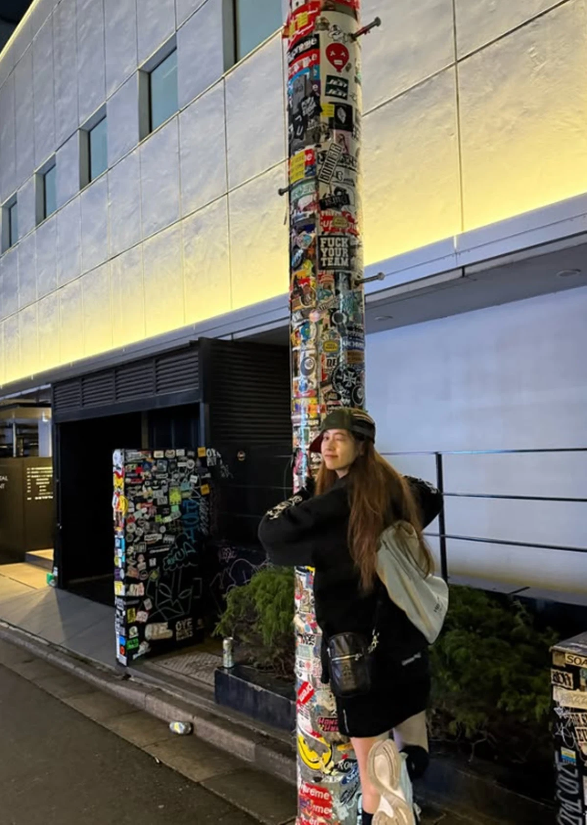또 다른 사진에서는 장난기 어린 표정과 브이 포즈로 사랑스러운 매력을 더했으며, 거리의 한 기둥에 기대 선 채 자유로운 감성을 드러내기도 했다.