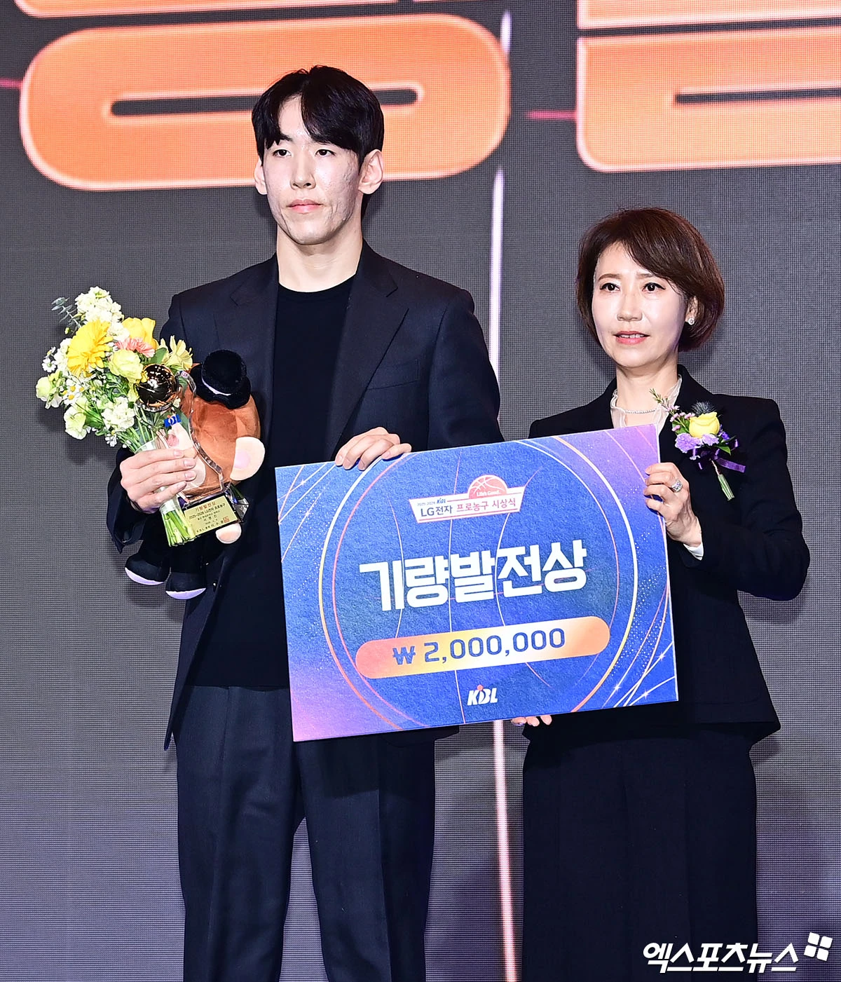 (엑스포츠뉴스 박지영 기자) 9일 오후 서울 삼성동 그랜드 인터컨티넨탈 파르나스 그랜드볼룸에서 열린 '2025-2026 LG전자 프로농구 시상식'에 참석한 현대모비스 서명진이 기량발전상 수상 기념 촬영을 하고 있다.