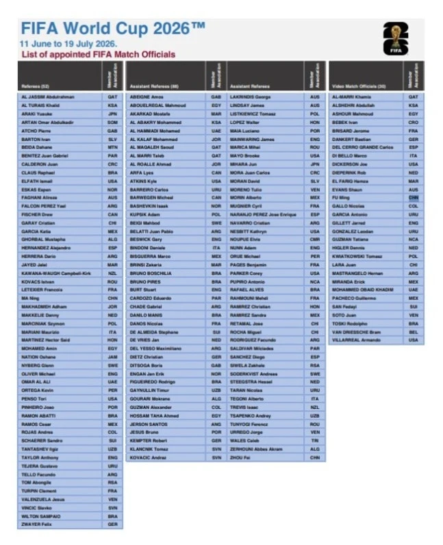 FIFA는 "심판들은 6개 대륙 연맹, 50개 회원국에서 선발됐다"며 "월드컵 역사상 가장 포괄적인 심판진"이라고 했다.
