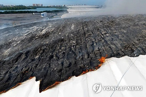 특히 이번 화재로 경기장 지붕 상당 부분이 소실됐다. 매체는 "지붕 절반이 불에 타 무너졌다"면서 "합성 소재로 만들어진 구조물이 녹아내리며 거미줄과 비슷한 형태의 물질이 생성됐다"고 설명했다.