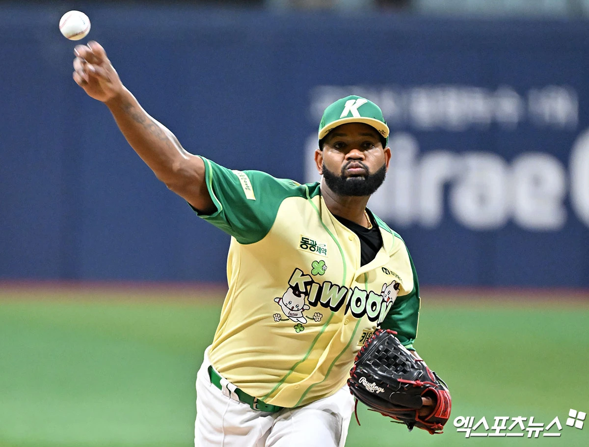 (엑스포츠뉴스 고척, 김한준 기자) 10일 오후 서울 구로구 고척스카이돔에서 열린 '2026 신한 SOL Bank KBO리그' 롯데 자이언츠와 키움 히어로즈의 경기, 1회초 키움 선발투수 알칸타라가 공을 힘차게 던지고 있다.