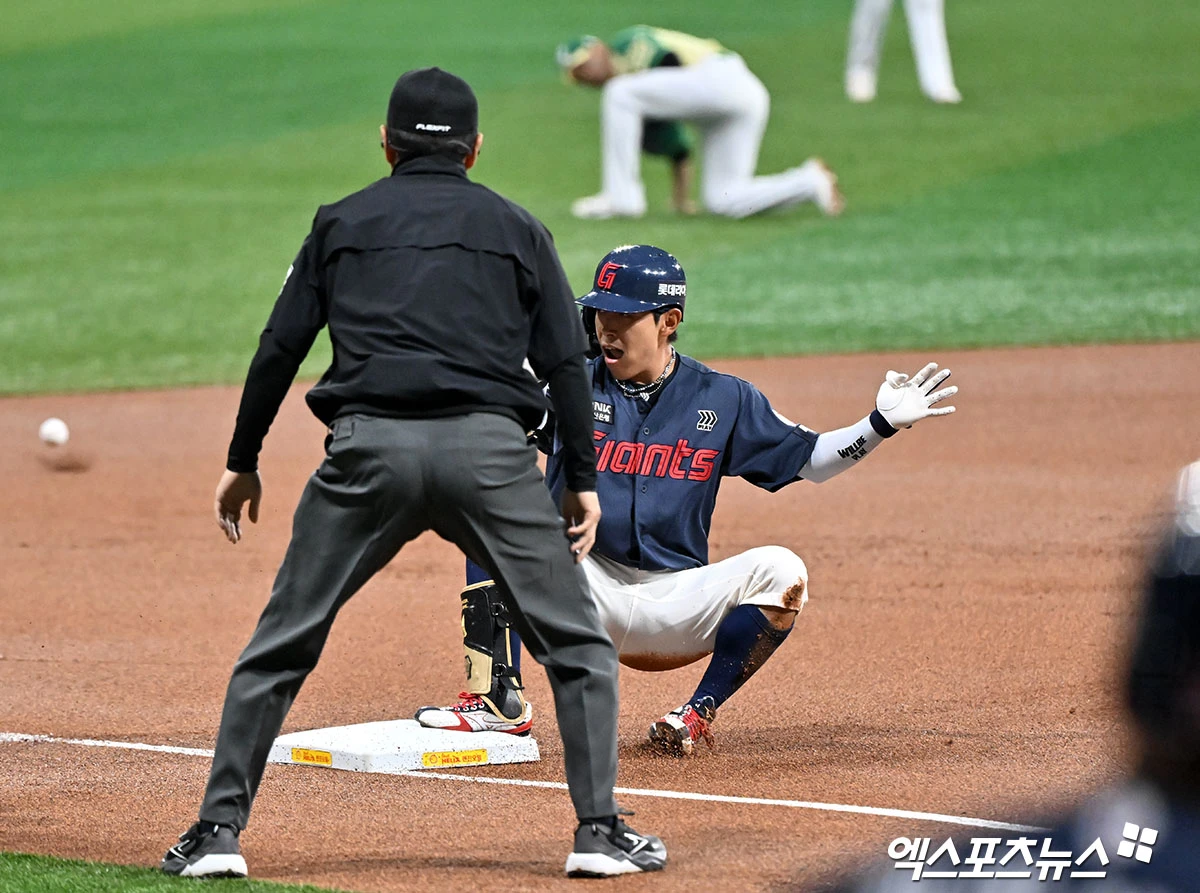 (엑스포츠뉴스 고척, 김한준 기자) 10일 오후 서울 구로구 고척스카이돔에서 열린 '2026 신한 SOL Bank KBO리그' 롯데 자이언츠와 키움 히어로즈의 경기, 1회초 롯데 황성빈이 3루타를 날리고 있다.