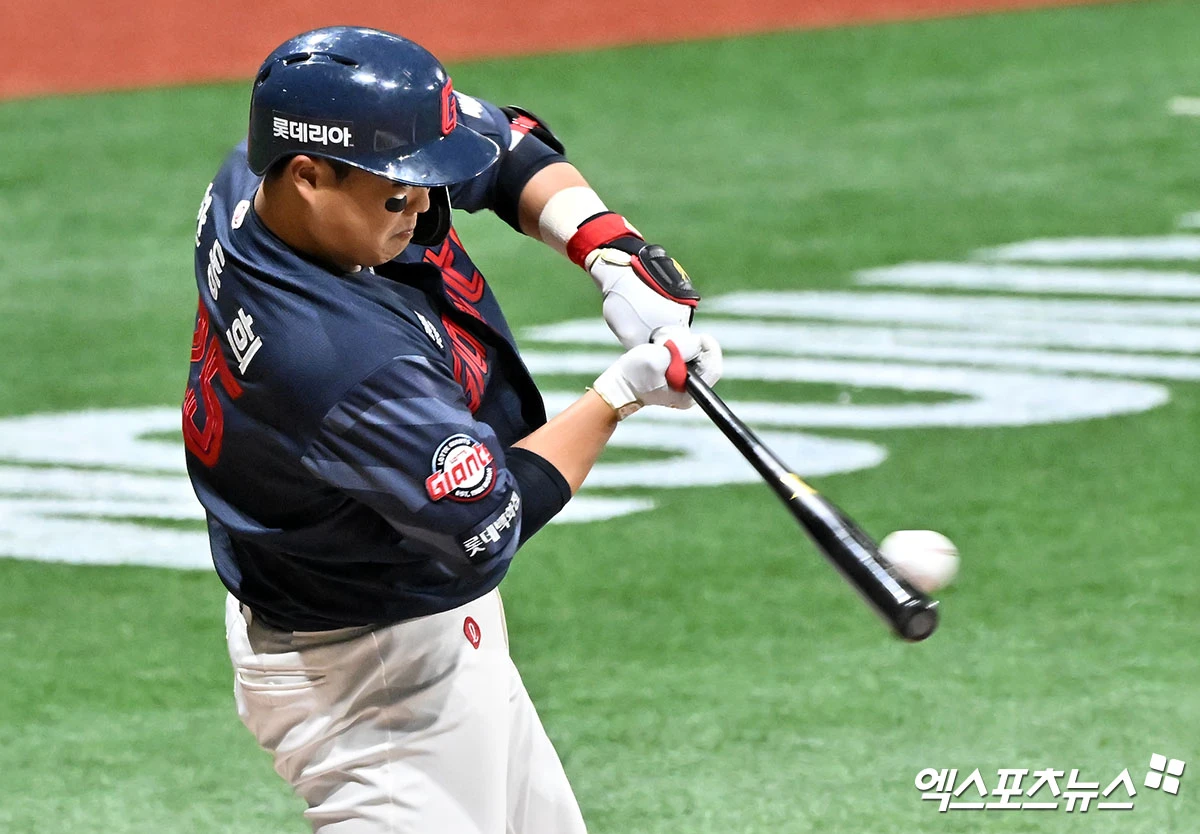 (엑스포츠뉴스 고척, 김한준 기자) 10일 오후 서울 구로구 고척스카이돔에서 열린 '2026 신한 SOL Bank KBO리그' 롯데 자이언츠와 키움 히어로즈의 경기, 1회초 1사 1루 롯데 한동희가 중전안타를 날리고 있다.