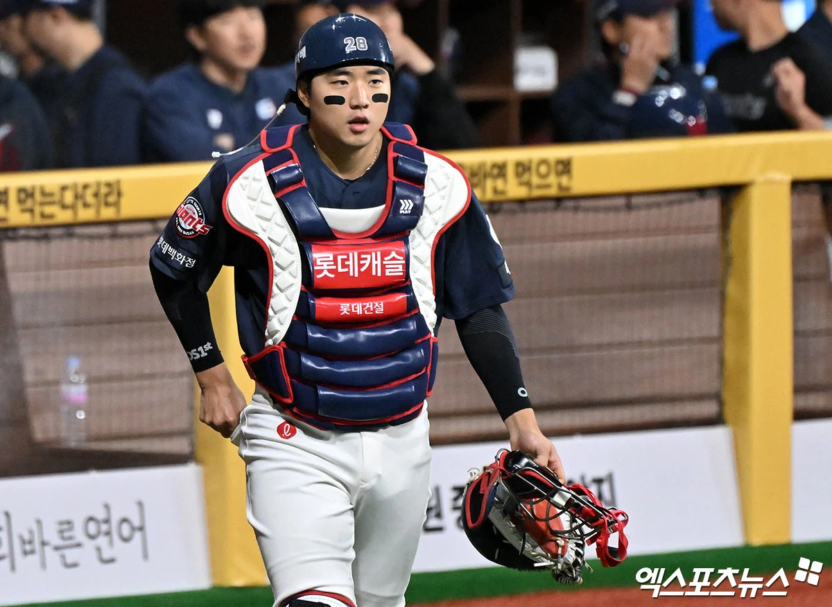 (엑스포츠뉴스 고척, 김한준 기자) 10일 오후 서울 구로구 고척스카이돔에서 열린 '2026 신한 SOL Bank KBO리그' 롯데 자이언츠와 키움 히어로즈의 경기, 1회말 롯데 손성빈이 그라운드로 나오고 있다.
