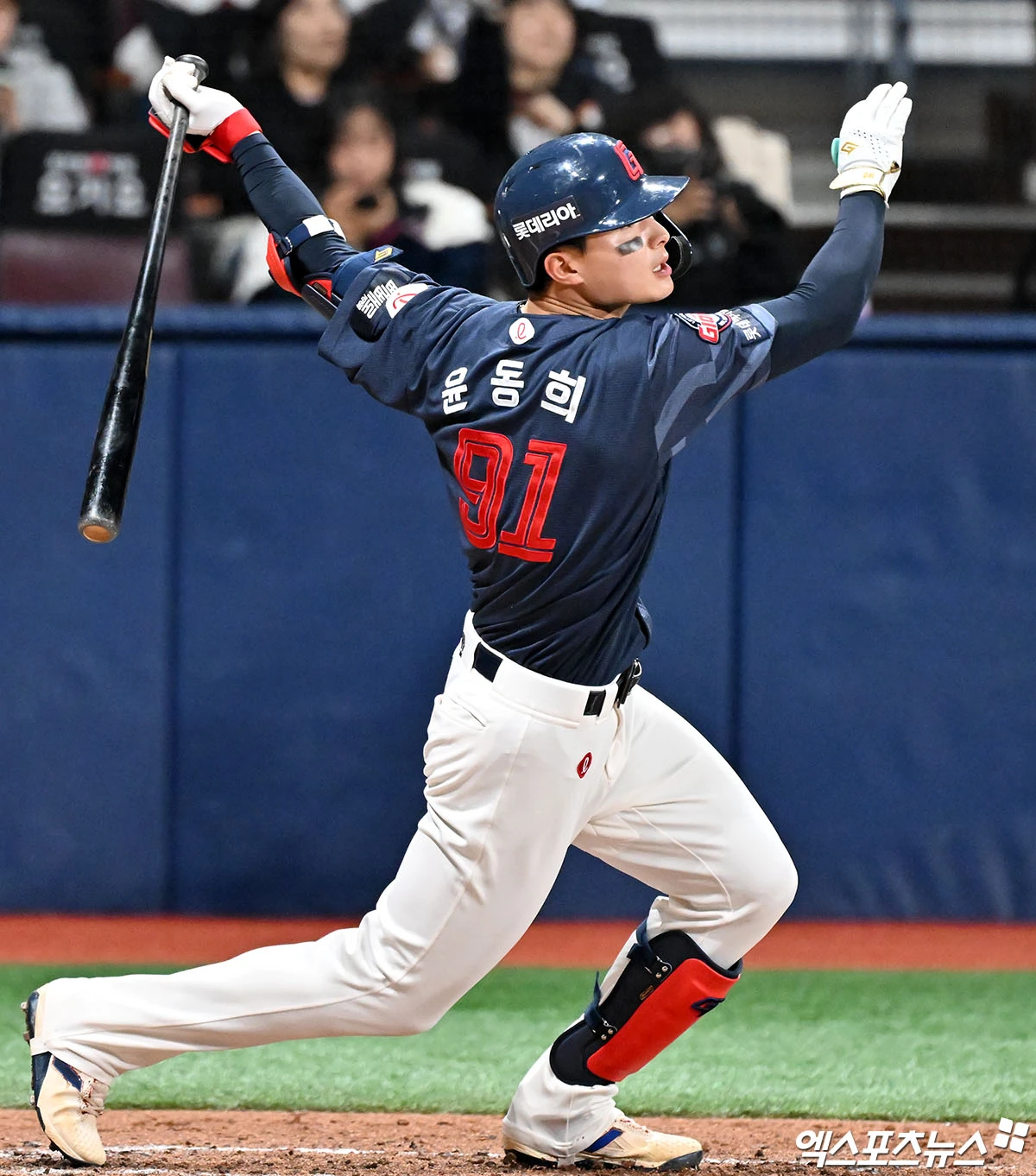 (엑스포츠뉴스 고척, 김한준 기자) 10일 오후 서울 구로구 고척스카이돔에서 열린 '2026 신한 SOL Bank KBO리그' 롯데 자이언츠와 키움 히어로즈의 경기, 4회초 롯데 윤동희가 타격을 하고 있다. 결과는 중견수 플라이 아웃.