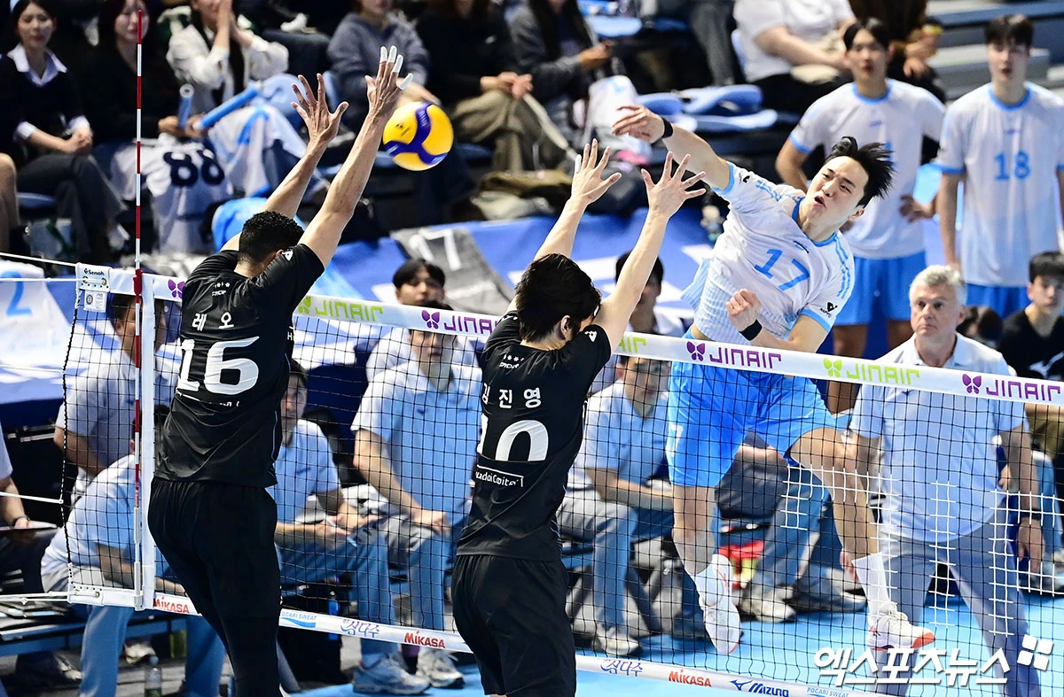 (엑스포츠뉴스 인천, 박지영 기자) 10일 오후 인천 계양체육관에서 열린 '진에어 2025-2026 V-리그' 대한항공과 현대캐피탈의 챔피언결정전 5차전 경기, 대한항공 임동혁이 공격을 하고 있다.