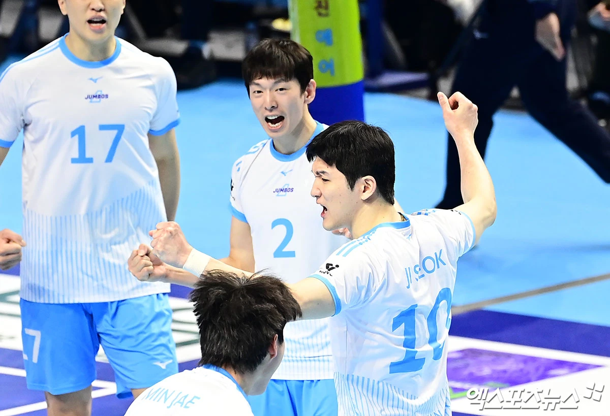 (엑스포츠뉴스 인천, 박지영 기자) 10일 오후 인천 계양체육관에서 열린 '진에어 2025-2026 V-리그' 대한항공과 현대캐피탈의 챔피언결정전 5차전 경기, 대한항공 한선수와 정지석이 득점에 기뻐하고 있다.