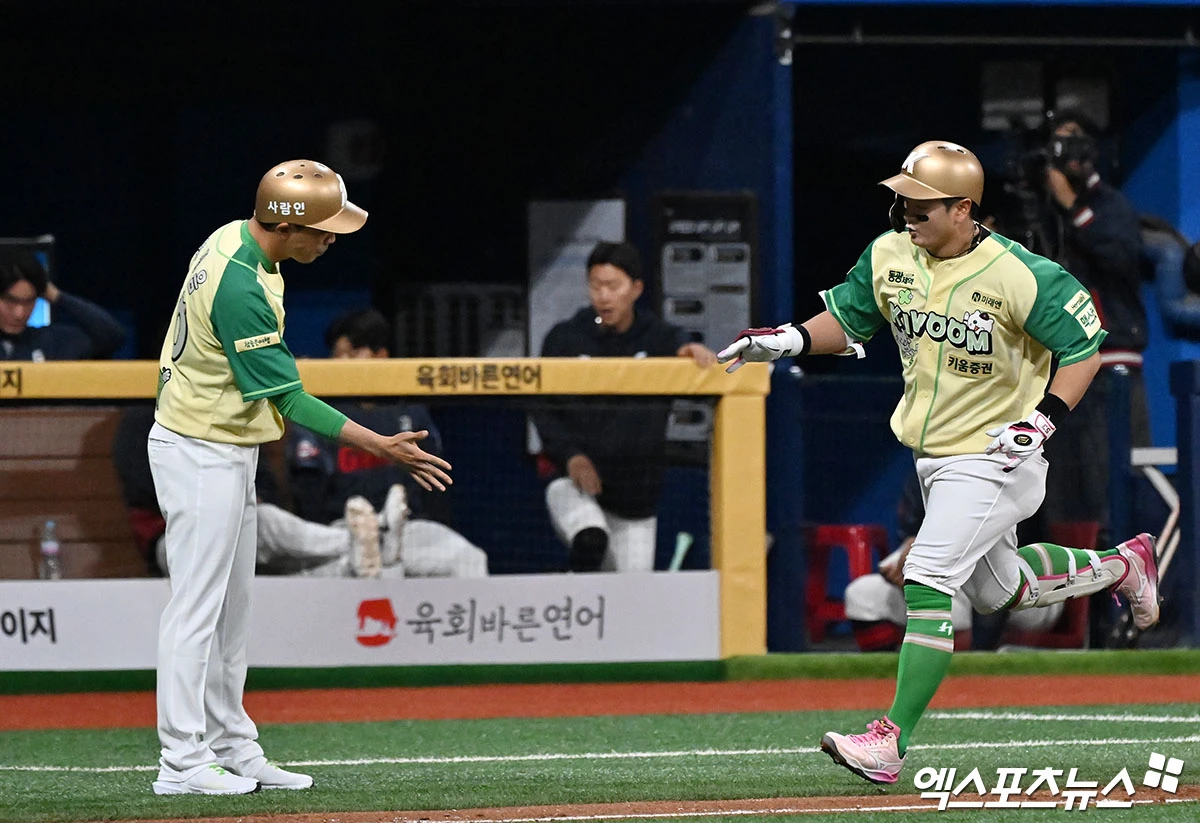 (엑스포츠뉴스 고척, 김한준 기자) 10일 오후 서울 구로구 고척스카이돔에서 열린 '2026 신한 SOL Bank KBO리그' 롯데 자이언츠와 키움 히어로즈의 경기, 4회말 키움 최주환이 솔로 홈런을 날린 후 기뻐하고 있다.