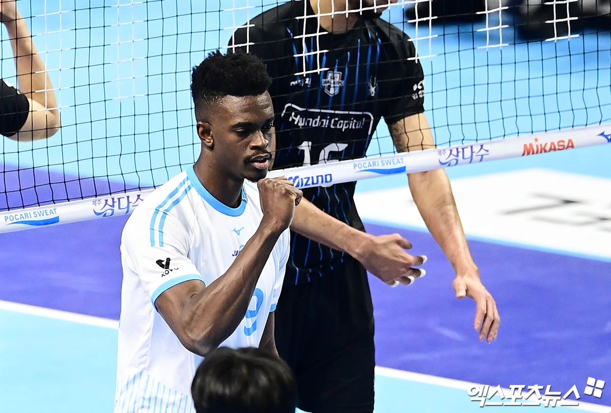 (엑스포츠뉴스 인천, 박지영 기자) 10일 오후 인천 계양체육관에서 열린 '진에어 2025-2026 V-리그' 대한항공과 현대캐피탈의 챔피언결정전 5차전 경기, 대한항공 마쏘가 득점에 기뻐하고 있다.