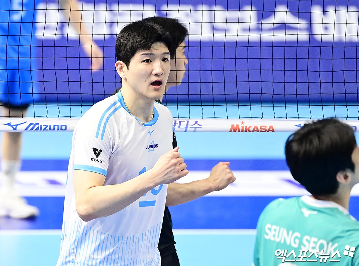(엑스포츠뉴스 인천, 박지영 기자) 10일 오후 인천 계양체육관에서 열린 '진에어 2025-2026 V-리그' 대한항공과 현대캐피탈의 챔피언결정전 5차전 경기, 대한항공 정지석이 득점에 기뻐하고 있다.