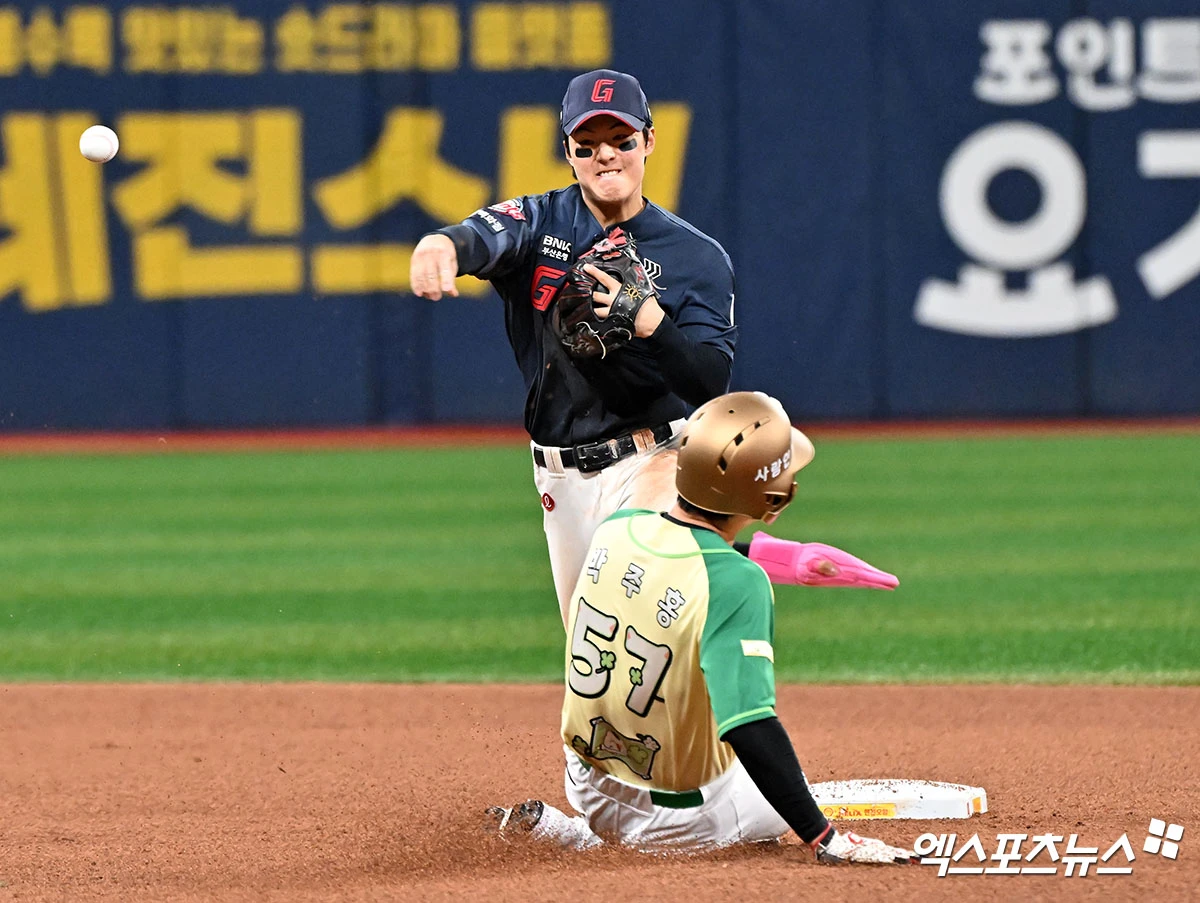 (엑스포츠뉴스 고척, 김한준 기자) 10일 오후 서울 구로구 고척스카이돔에서 열린 '2026 신한 SOL Bank KBO리그' 롯데 자이언츠와 키움 히어로즈의 경기, 7회말 1사 1루 롯데 한태양이 키움 김건희의 내야땅볼때 박주홍을 포스아웃 시킨 후 1루로 송구하고 있다.