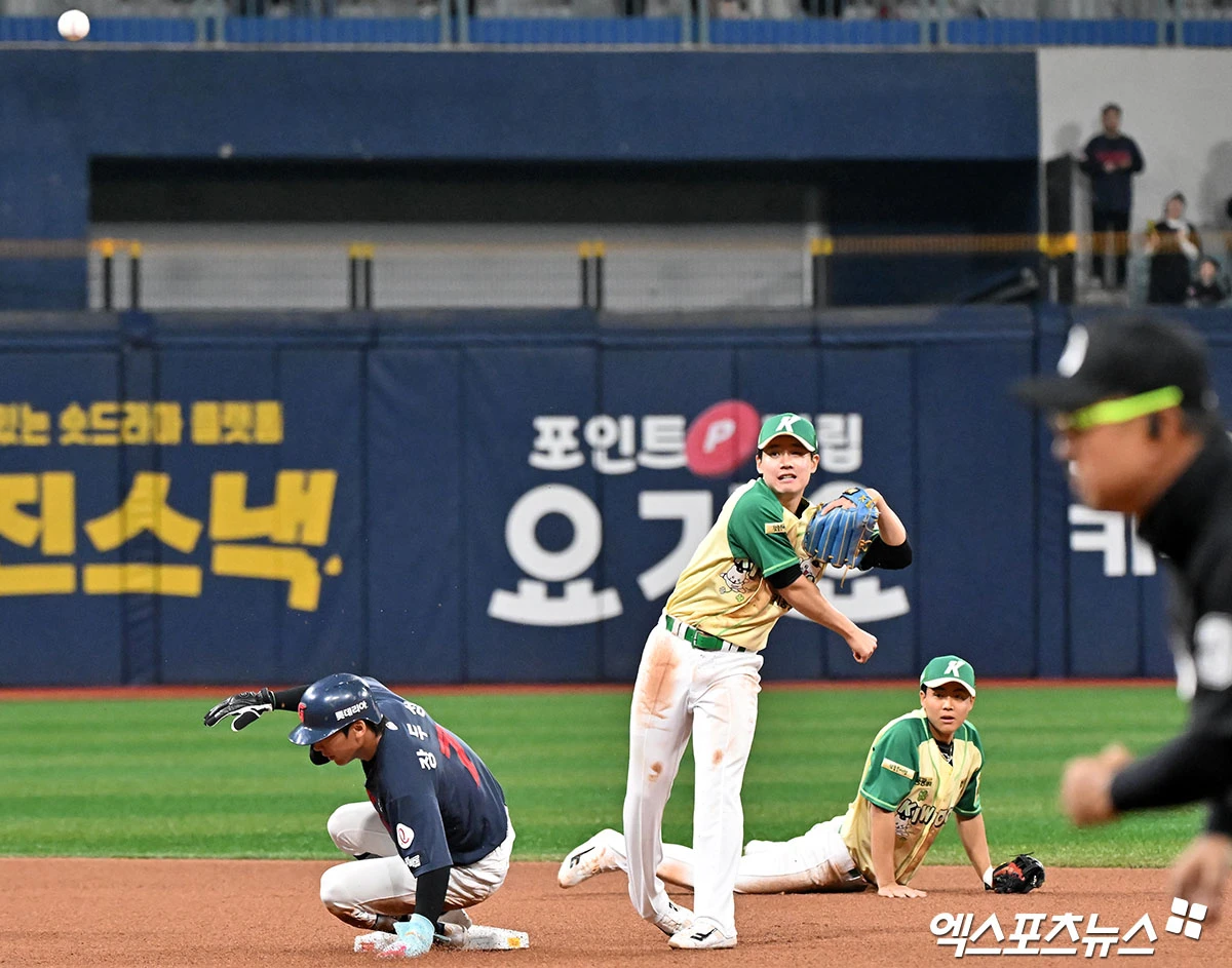 (엑스포츠뉴스 고척, 김한준 기자) 10일 오후 서울 구로구 고척스카이돔에서 열린 '2026 신한 SOL Bank KBO리그' 롯데 자이언츠와 키움 히어로즈의 경기, 8회초 무사 1루 키움 박한결이 롯데 전준우의 내야땅볼때 장두성을 포스아웃 시킨 후 1루로 송구하고 있다.