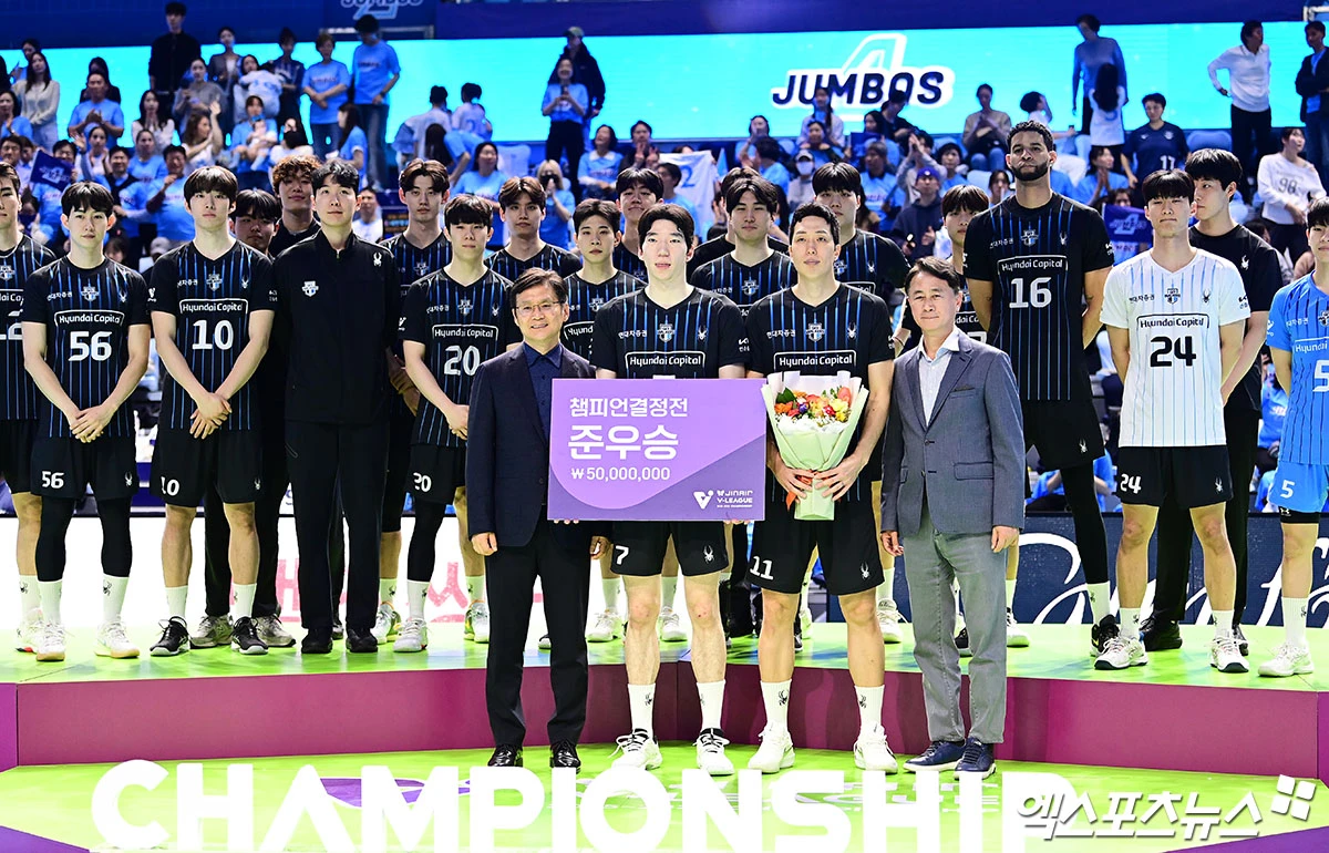 경기 종료 후 현대캐피탈 선수단이 준우승 수상 기념 촬영을 하고 있다.