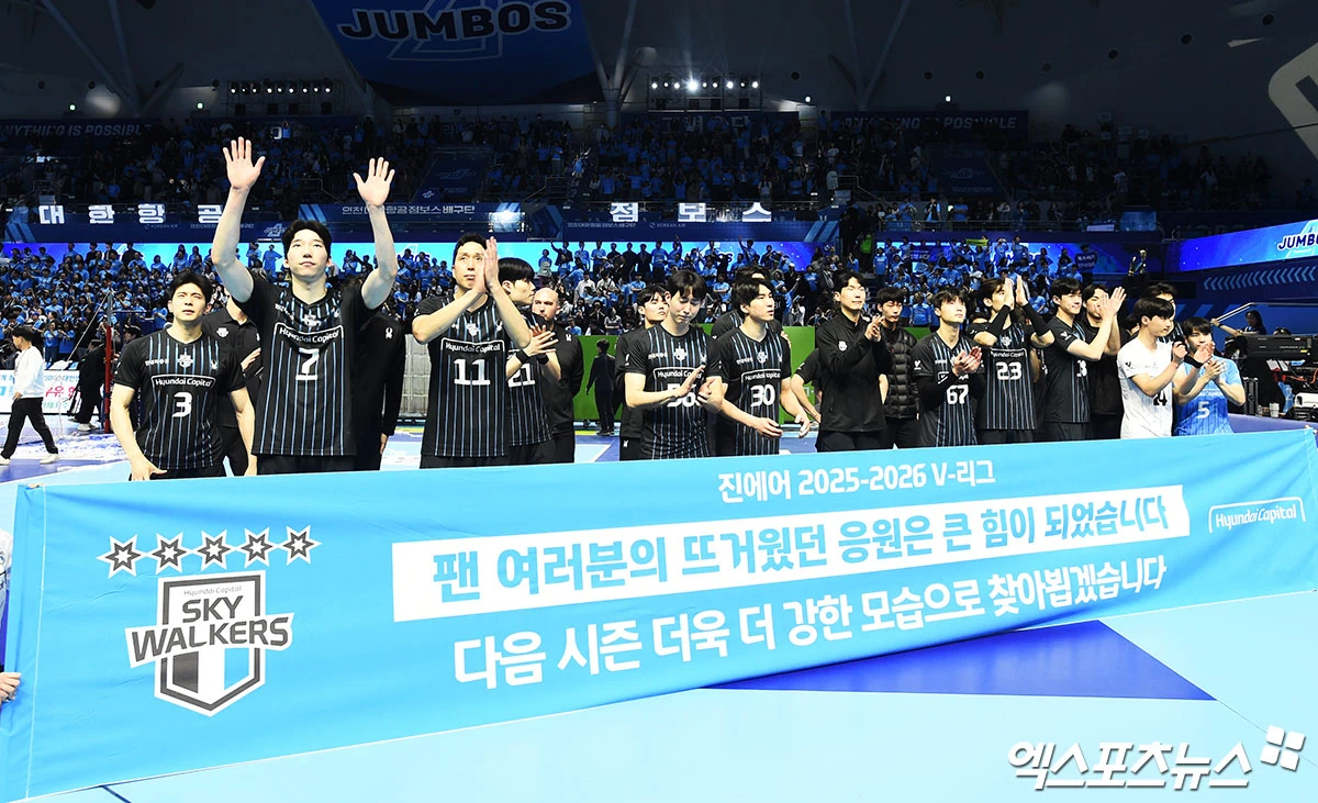 (엑스포츠뉴스 인천, 박지영 기자) 10일 오후 인천 계양체육관에서 열린 '진에어 2025-2026 V-리그' 대한항공과 현대캐피탈의 챔피언결정전 5차전 경기, 대한항공이 세트 스코어 3:1(25:18, 25:21, 19:25, 25:23)로 승리하며 트레블을 달성했다.