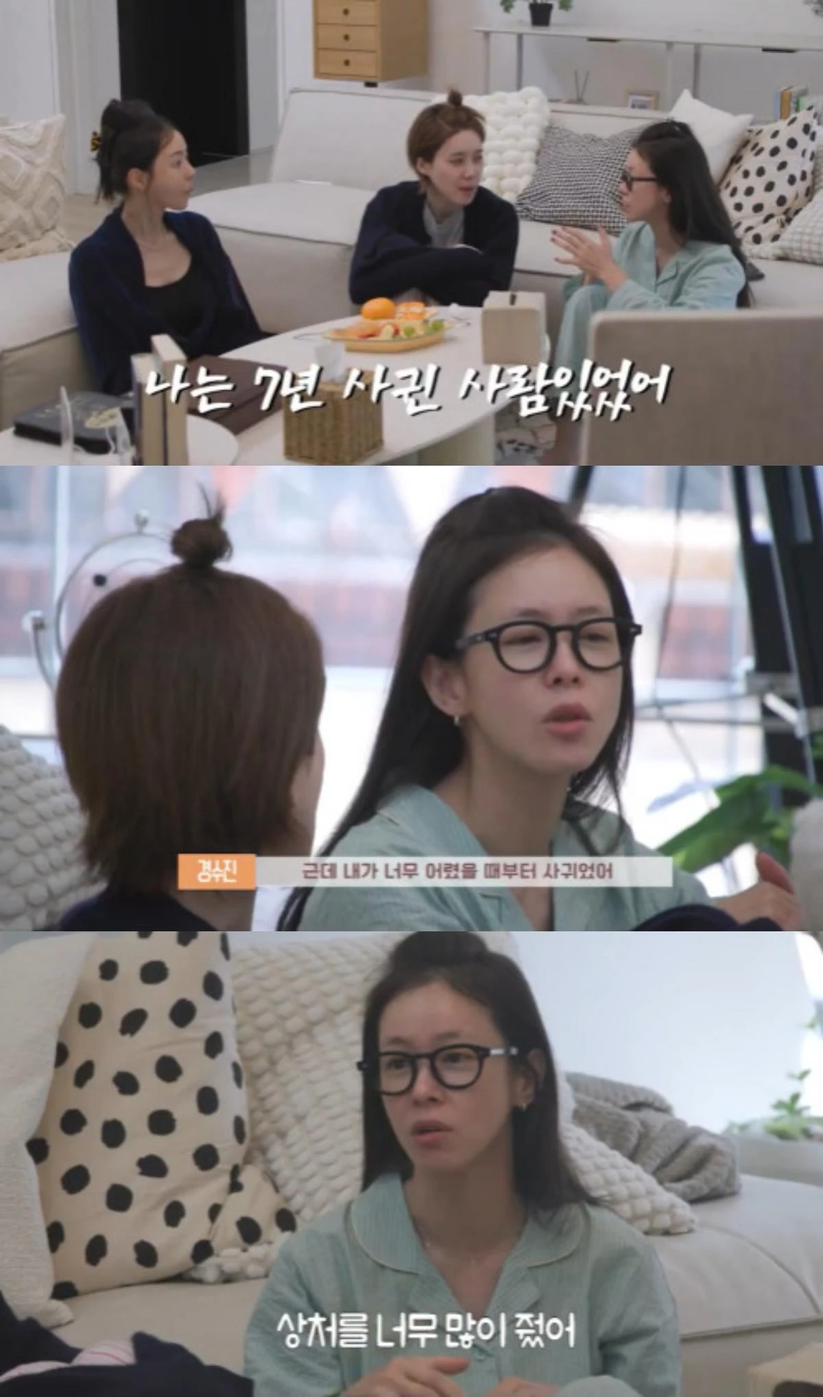 이날 민낯으로 방에 모여앉은 세 사람은 각자의 연애 경험을 고백했다.