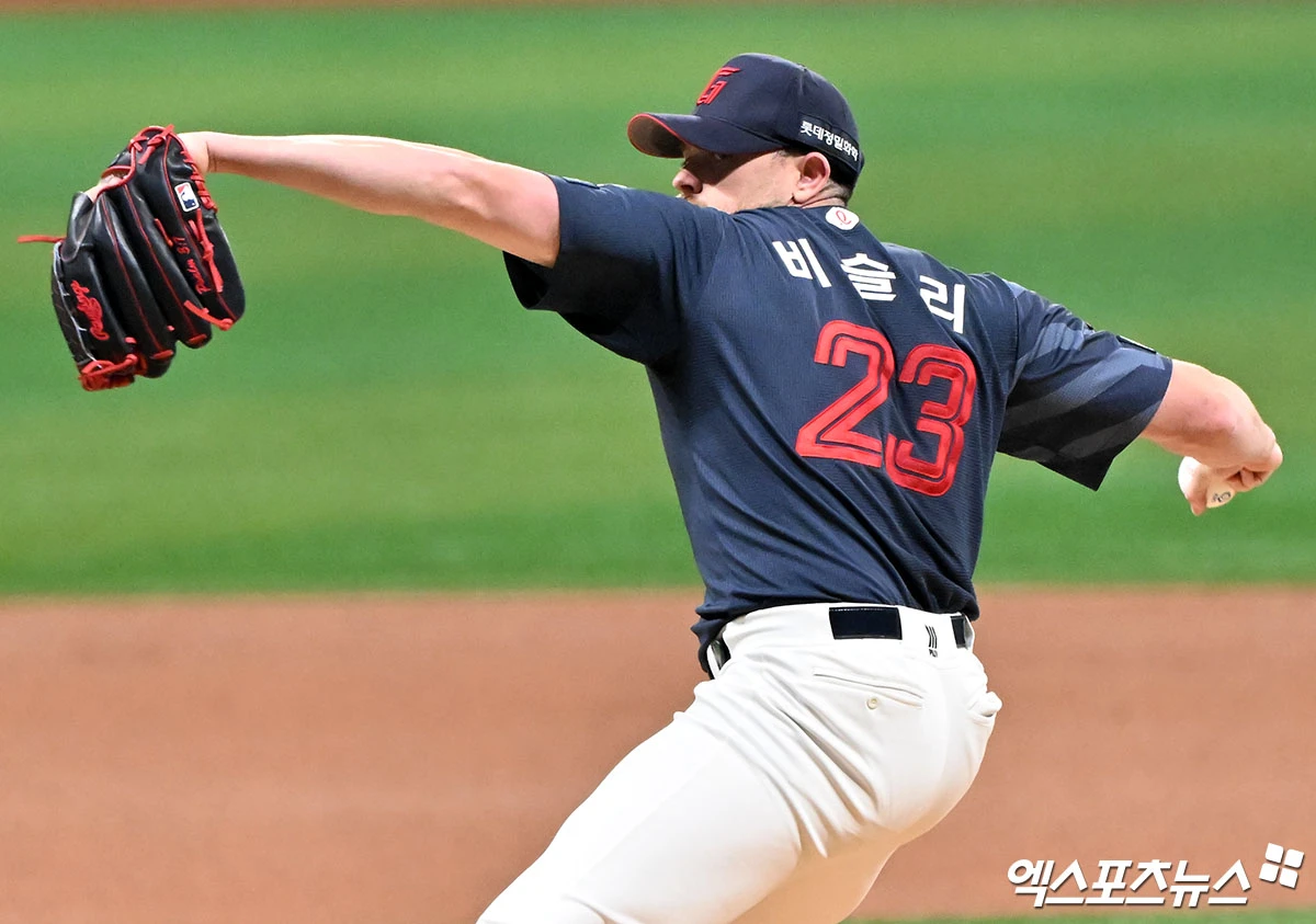 (엑스포츠뉴스 고척, 김한준 기자) 11일 오후 서울 구로구 고척스카이돔에서 열린 '2026 신한 SOL Bank KBO리그' 롯데 자이언츠와 키움 히어로즈의 경기, 1회말 롯데 선발투수 비슬리가 공을 힘차게 던지고 있다.