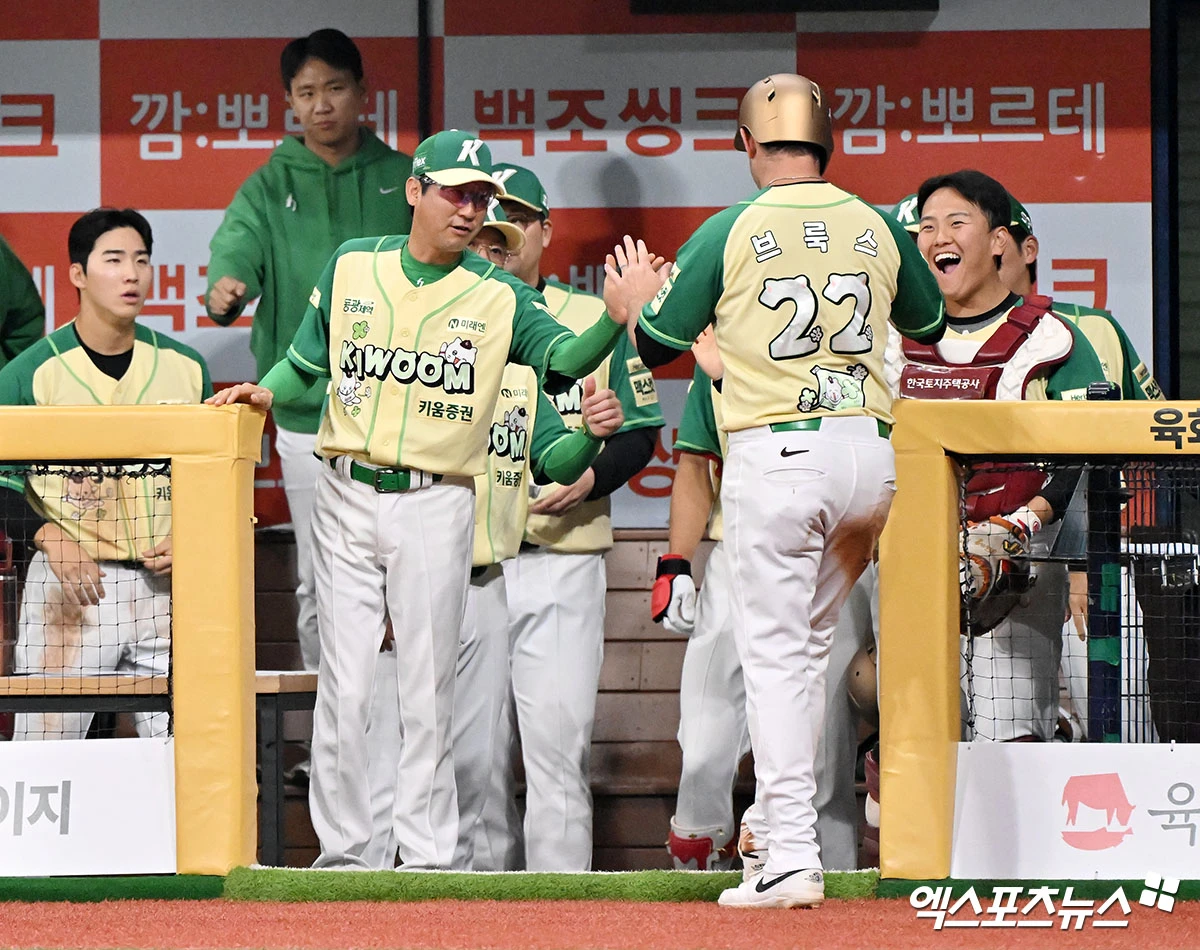 (엑스포츠뉴스 고척, 김한준 기자) 11일 오후 서울 구로구 고척스카이돔에서 열린 '2026 신한 SOL Bank KBO리그' 롯데 자이언츠와 키움 히어로즈의 경기, 1회말 2사 2루 키움 브룩스가 최주환의 1타점 2루타때 득점에 성공하고 있다.