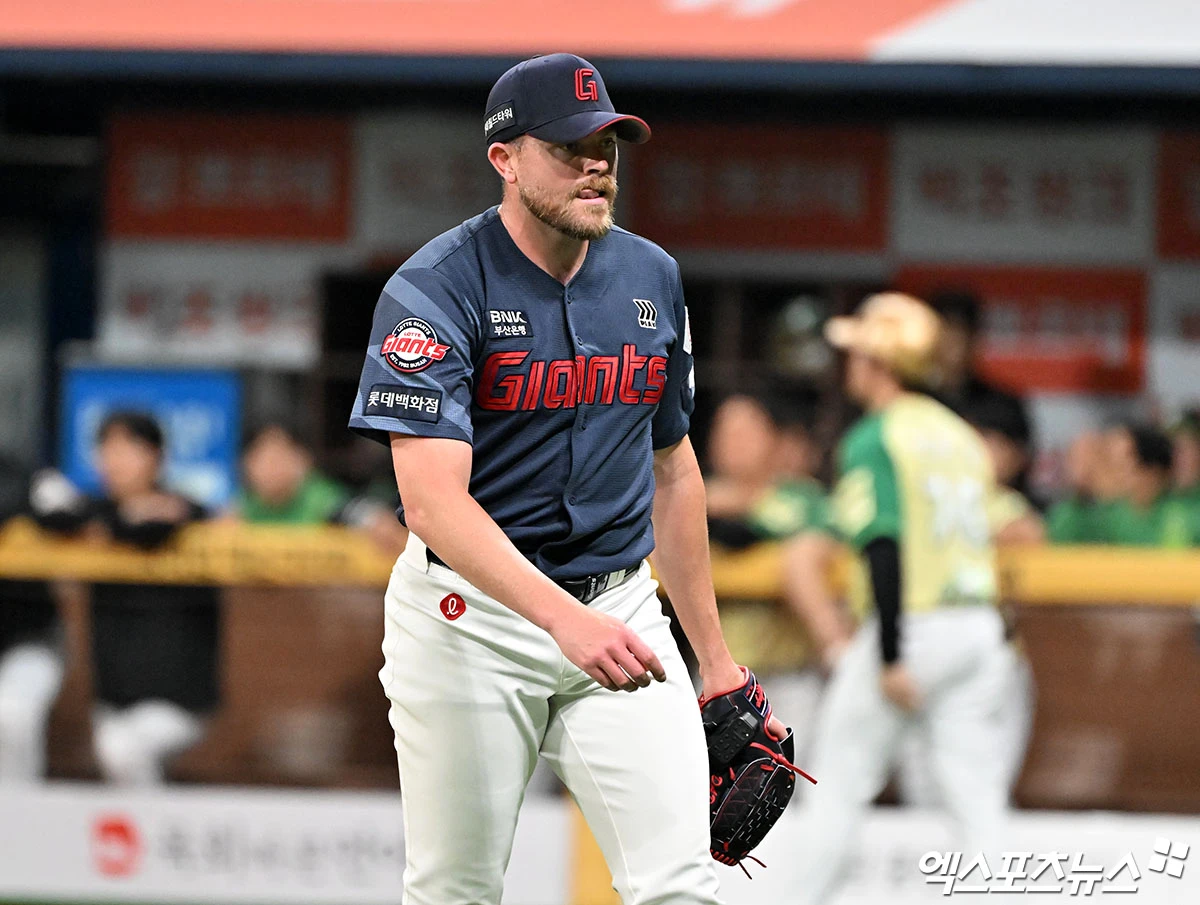(엑스포츠뉴스 고척, 김한준 기자) 11일 오후 서울 구로구 고척스카이돔에서 열린 '2026 신한 SOL Bank KBO리그' 롯데 자이언츠와 키움 히어로즈의 경기, 1회말 수비를 마친 롯데 비슬리가 더그아웃으로 향하고 있다.