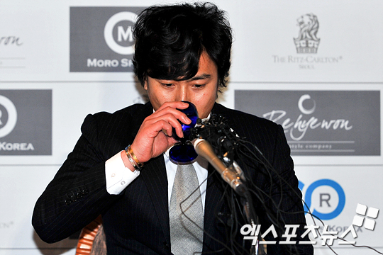 [엑스포츠뉴스=리츠칼튼, 권혁재 기자] '반지의 제왕' 안정환이 31일 오전 서울 리츠칼튼호텔에서 열린 은퇴 기자회견에서 취재진의 질문을 기다리며 물을 마시고 있다.