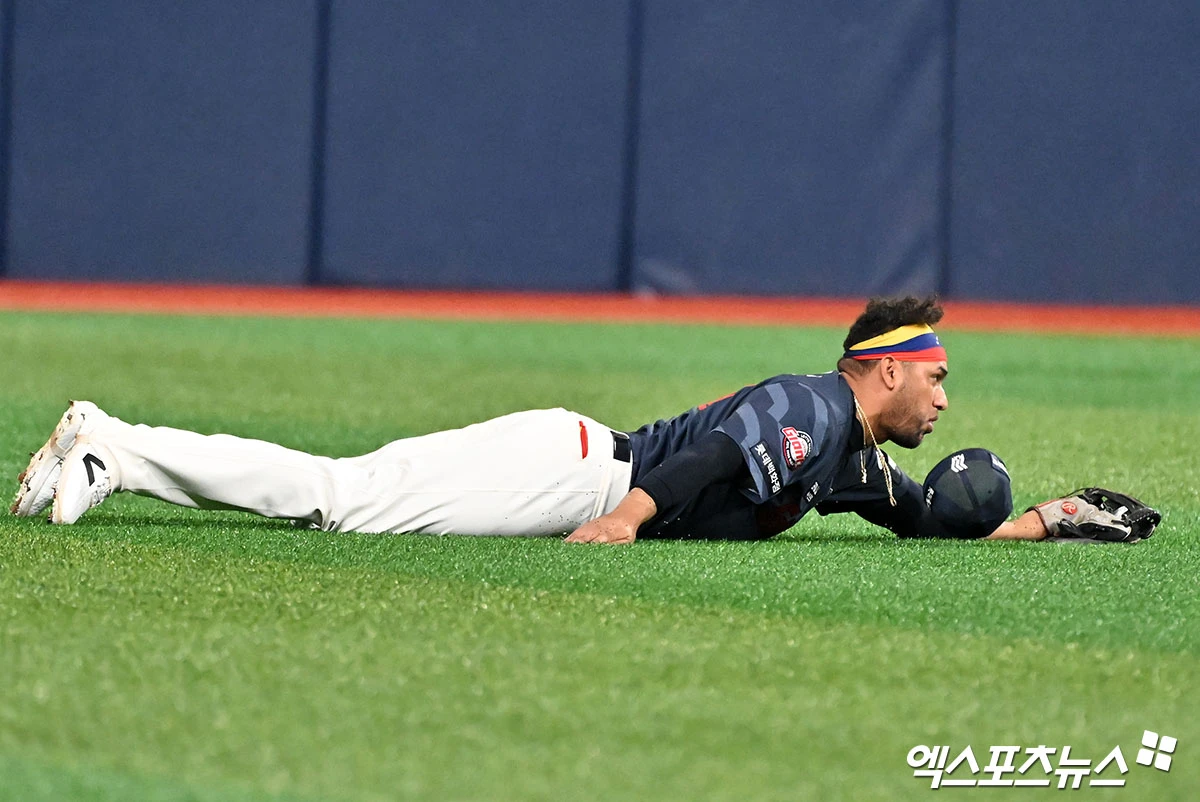 (엑스포츠뉴스 고척, 김한준 기자) 11일 오후 서울 구로구 고척스카이돔에서 열린 '2026 신한 SOL Bank KBO리그' 롯데 자이언츠와 키움 히어로즈의 경기, 3회말 롯데 레이예스가 키움 김건희의 타구를 잡아내고 있다.