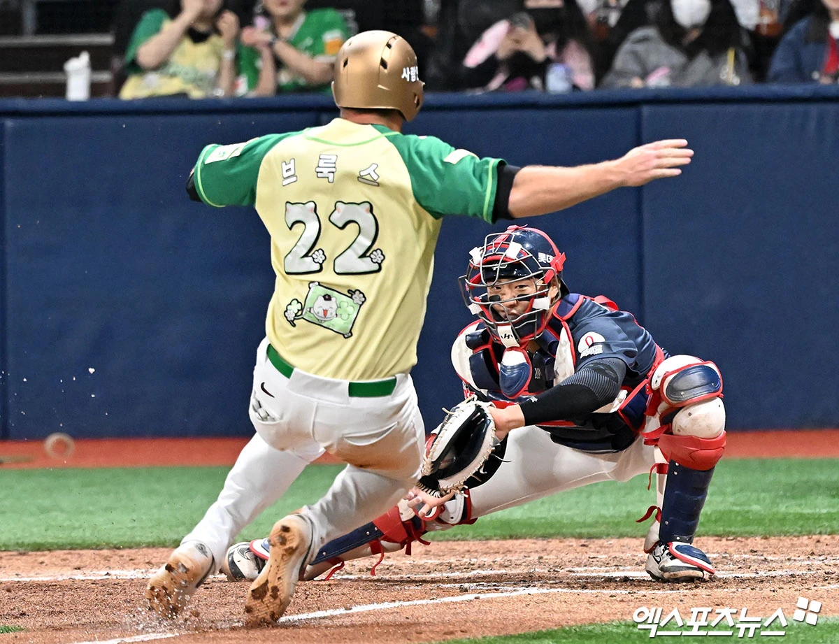 (엑스포츠뉴스 고척, 김한준 기자) 11일 오후 서울 구로구 고척스카이돔에서 열린 '2026 신한 SOL Bank KBO리그' 롯데 자이언츠와 키움 히어로즈의 경기, 6회말 1사 만루 롯데 손성빈이 태그업을 시도하는 키움 브룩스를 태그아웃 시키고 있다.