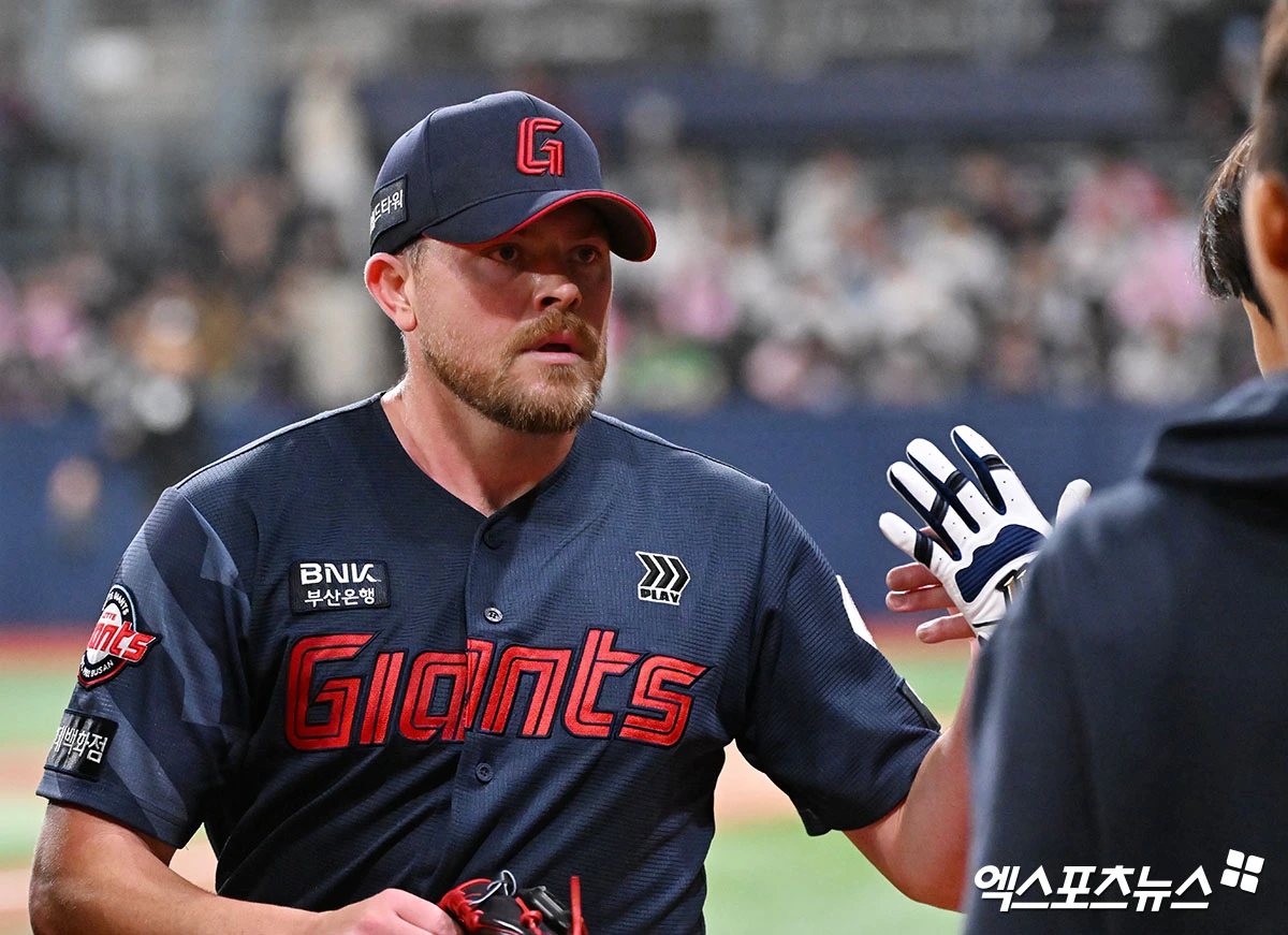 (엑스포츠뉴스 고척, 김한준 기자) 11일 오후 서울 구로구 고척스카이돔에서 열린 '2026 신한 SOL Bank KBO리그' 롯데 자이언츠와 키움 히어로즈의 경기, 6회말 수비를 마친 롯데 비슬리가 더그아웃으로 향하고 있다.