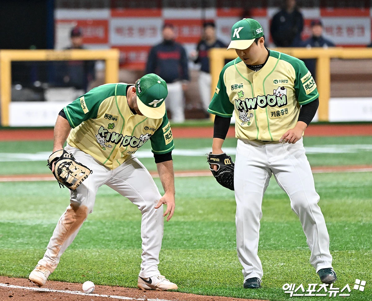 (엑스포츠뉴스 고척, 김한준 기자) 11일 오후 서울 구로구 고척스카이돔에서 열린 '2026 신한 SOL Bank KBO리그' 롯데 자이언츠와 키움 히어로즈의 경기, 9회초 무사 1루 키움 브룩스가 롯데 장두성의 번트 타구를 지켜보고 있다.