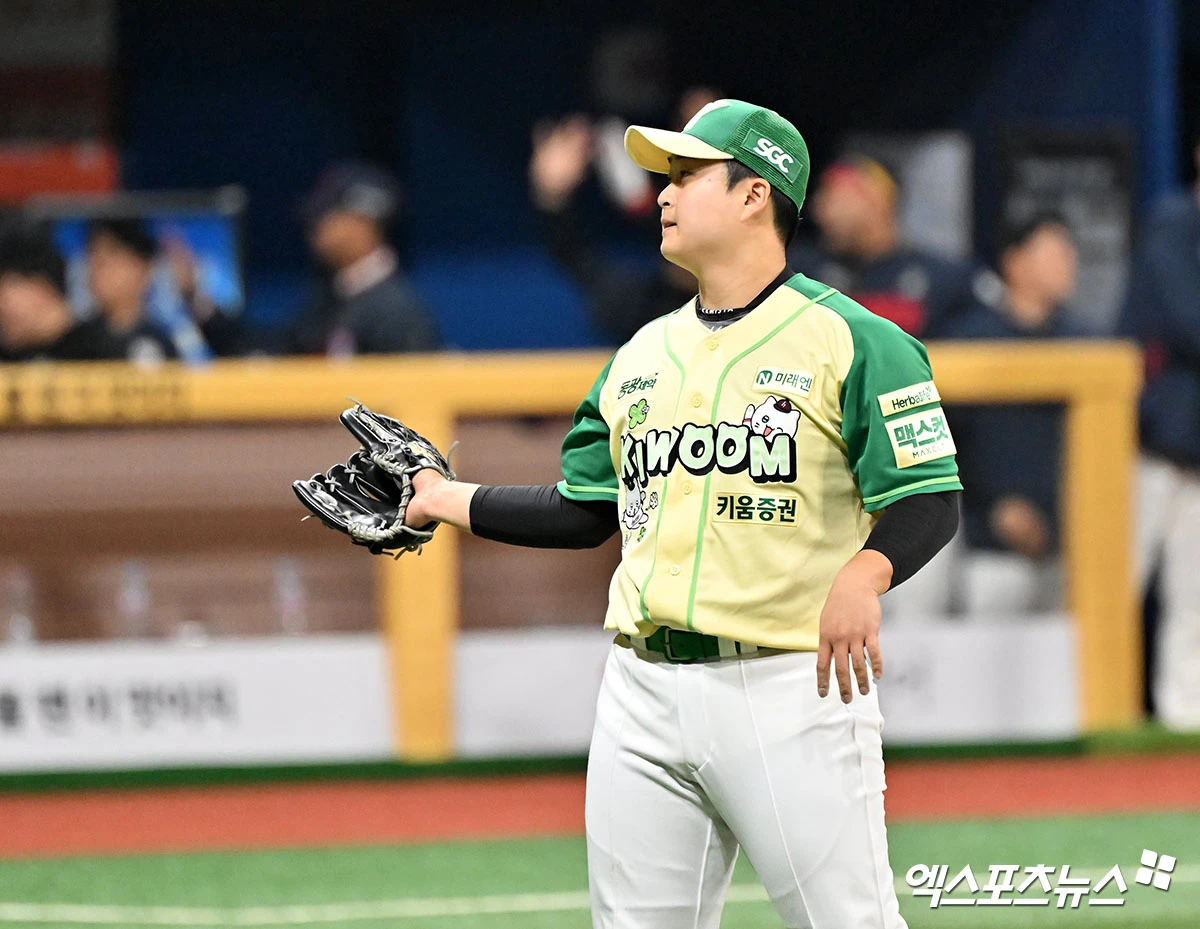 (엑스포츠뉴스 고척, 김한준 기자) 11일 오후 서울 구로구 고척스카이돔에서 열린 '2026 신한 SOL Bank KBO리그' 롯데 자이언츠와 키움 히어로즈의 경기, 9회초 1사 2,3루 키움 김재웅이 동점을 허용한 후 아쉬워하고 있다.