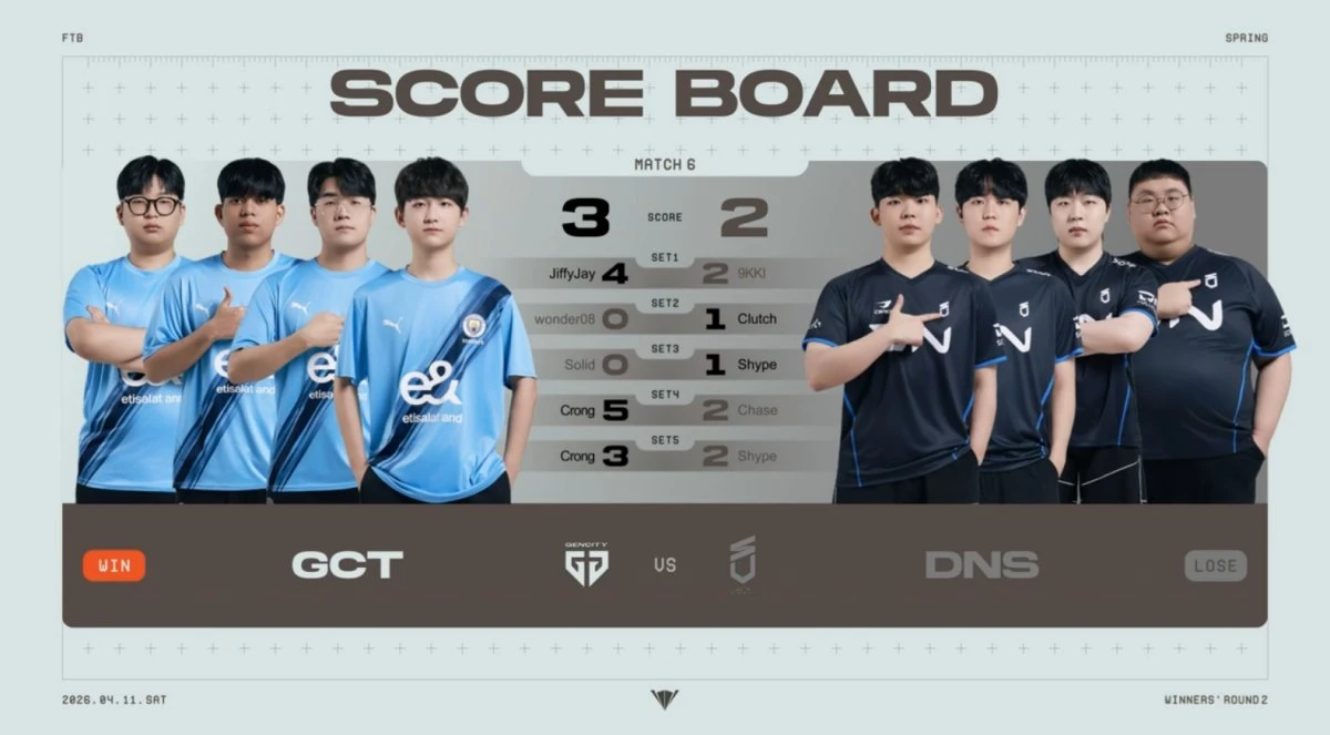2주 차 토요일에는 승자조 2라운드 경기가 준비됐다. 두 번째 경기의 주인공은 젠시티(GCT)와 DN 수퍼스(DNS). 1세트에는 GCT 'jiffyjay' 지프리 바이카뎀 선수와 DNS '9KKI' 김시경 선수가 나섰다.
