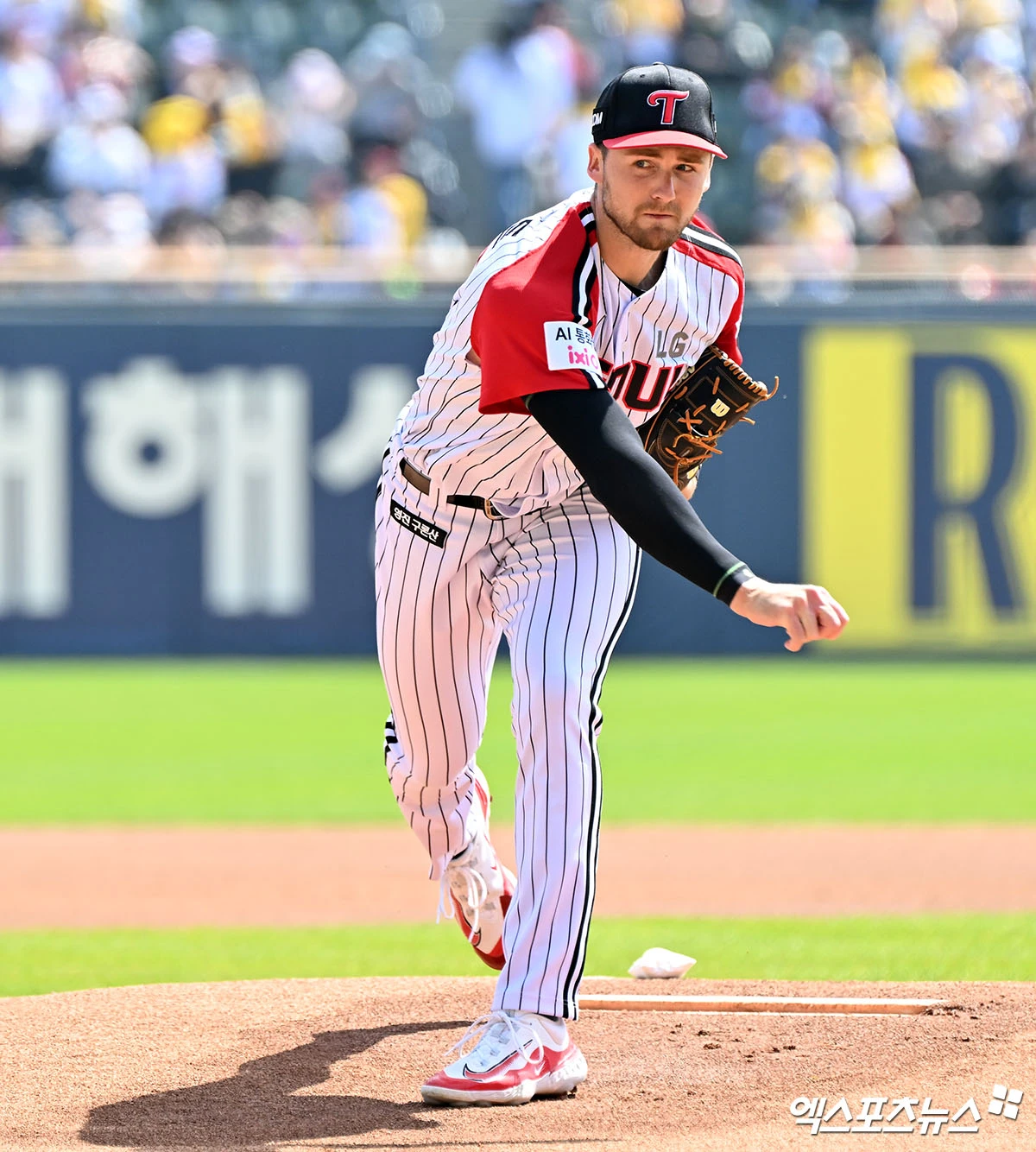(엑스포츠뉴스 잠실, 김한준 기자) 12일 오후 서울 송파구 잠실야구장에서 열린 '2026 신한 SOL Bank KBO리그' SSG 랜더스와 LG 트윈스의 경기, 1회초 LG 선발투수 톨허스트가 공을 힘차게 던지고 있다.
