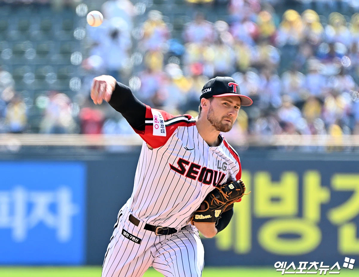 (엑스포츠뉴스 잠실, 김한준 기자) 12일 오후 서울 송파구 잠실야구장에서 열린 '2026 신한 SOL Bank KBO리그' SSG 랜더스와 LG 트윈스의 경기, 1회초 LG 선발투수 톨허스트가 공을 힘차게 던지고 있다.