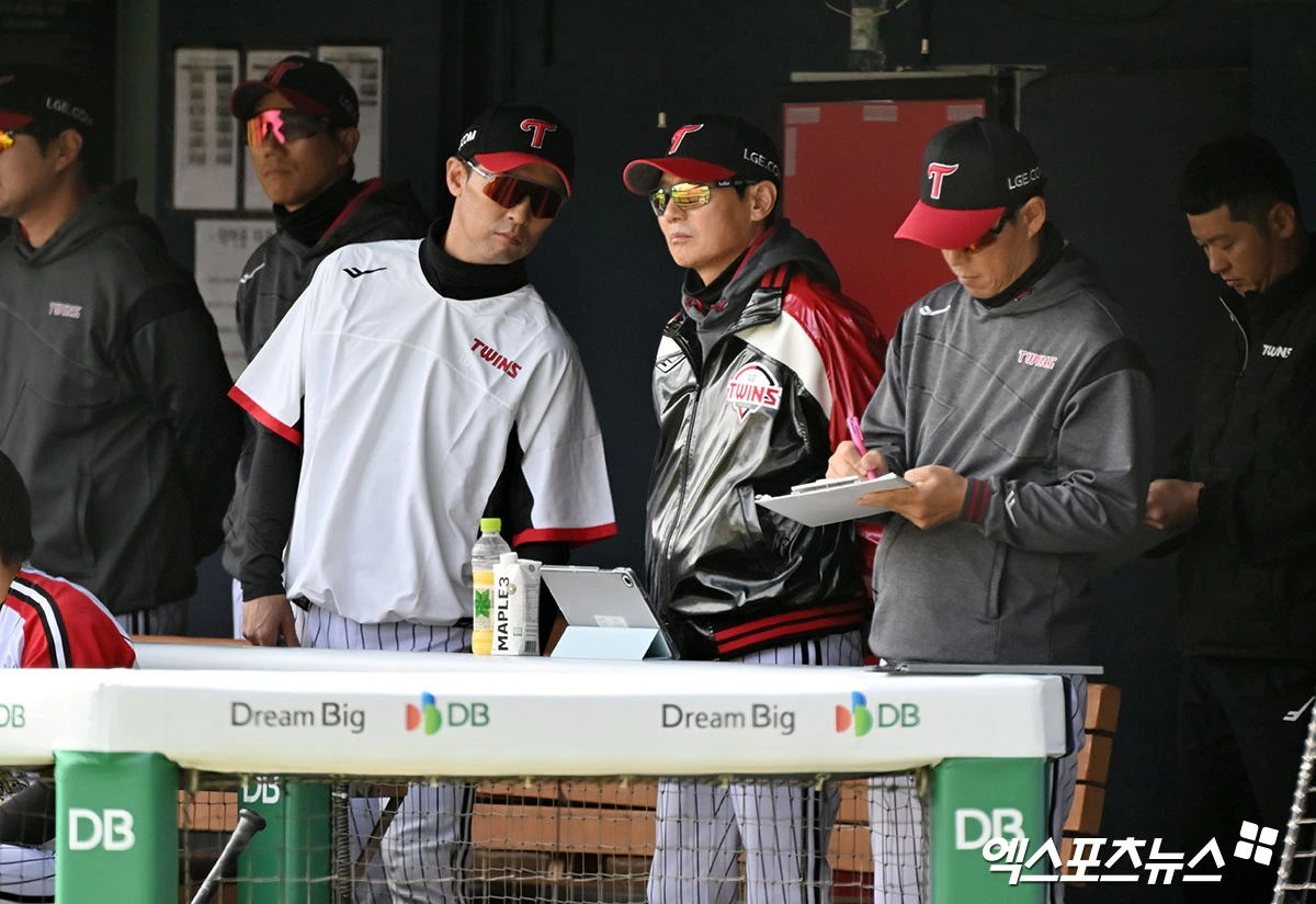 (엑스포츠뉴스 잠실, 김한준 기자) 12일 오후 서울 송파구 잠실야구장에서 열린 '2026 신한 SOL Bank KBO리그' SSG 랜더스와 LG 트윈스의 경기, 1회초 LG 염경엽 감독이 경기를 지켜보고 있다.