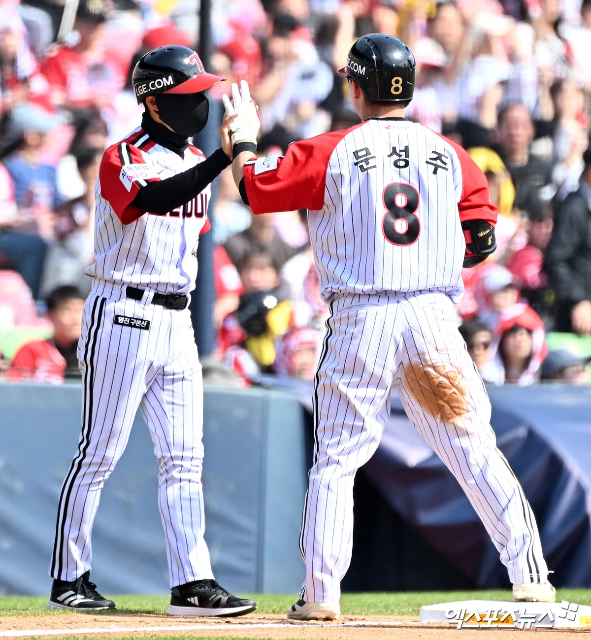 (엑스포츠뉴스 잠실, 김한준 기자) 12일 오후 서울 송파구 잠실야구장에서 열린 '2026 신한 SOL Bank KBO리그' SSG 랜더스와 LG 트윈스의 경기, 3회말 1사 2루 LG 문성주가 1타점 2루타를 날린 후 3루까지 진루하고 있다.