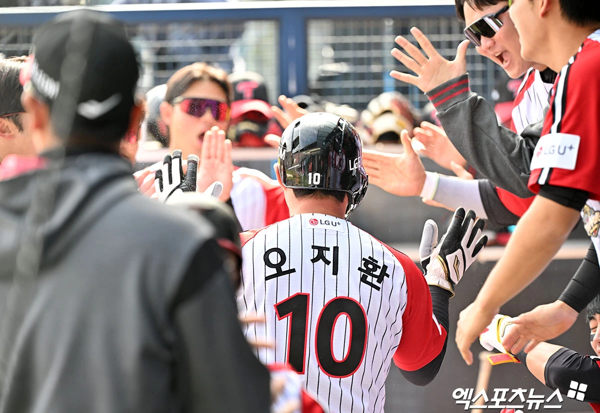 (엑스포츠뉴스 잠실, 김한준 기자) 12일 오후 서울 송파구 잠실야구장에서 열린 '2026 신한 SOL Bank KBO리그' SSG 랜더스와 LG 트윈스의 경기, 4회말 1사 3루 LG 오지환이 홍창기의 내야땅볼때 홈으로 쇄도하며 득점에 성공하고 있다.