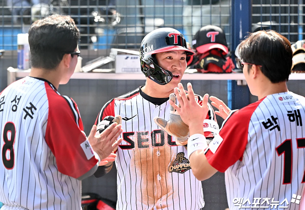 (엑스포츠뉴스 잠실, 김한준 기자) 12일 오후 서울 송파구 잠실야구장에서 열린 '2026 신한 SOL Bank KBO리그' SSG 랜더스와 LG 트윈스의 경기, 4회말 1사 3루 LG 오지환이 홍창기의 내야땅볼때 홈으로 쇄도하며 득점에 성공하고 있다.