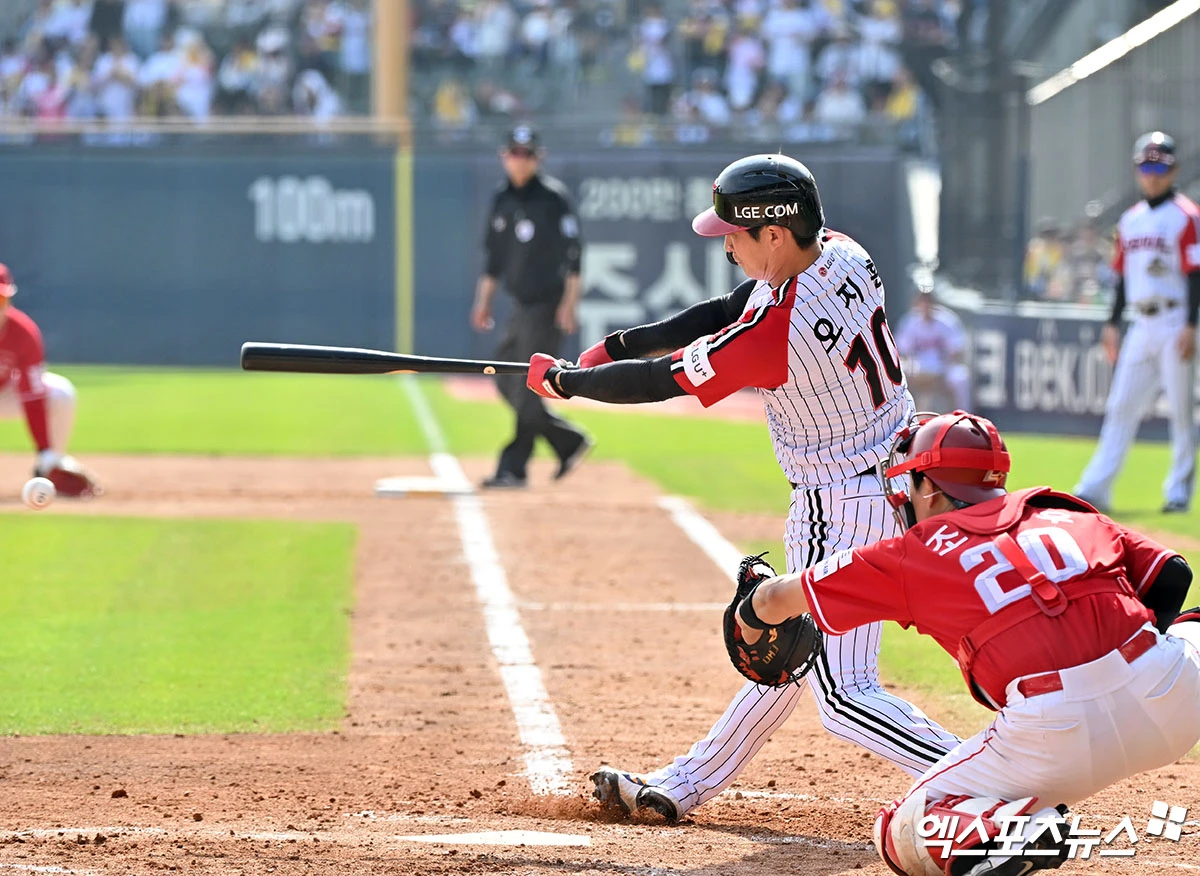 (엑스포츠뉴스 잠실, 김한준 기자) 12일 오후 서울 송파구 잠실야구장에서 열린 '2026 신한 SOL Bank KBO리그' SSG 랜더스와 LG 트윈스의 경기, 5회말 1사 1루 LG 오지환이 우중간 안타를 날리고 있다.