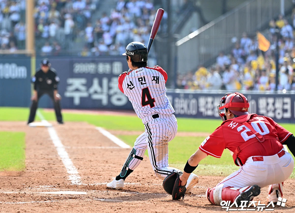(엑스포츠뉴스 잠실, 김한준 기자) 12일 오후 서울 송파구 잠실야구장에서 열린 '2026 신한 SOL Bank KBO리그' SSG 랜더스와 LG 트윈스의 경기, 5회말 1사 만루 LG 신민재가 타격을 하고 있다.