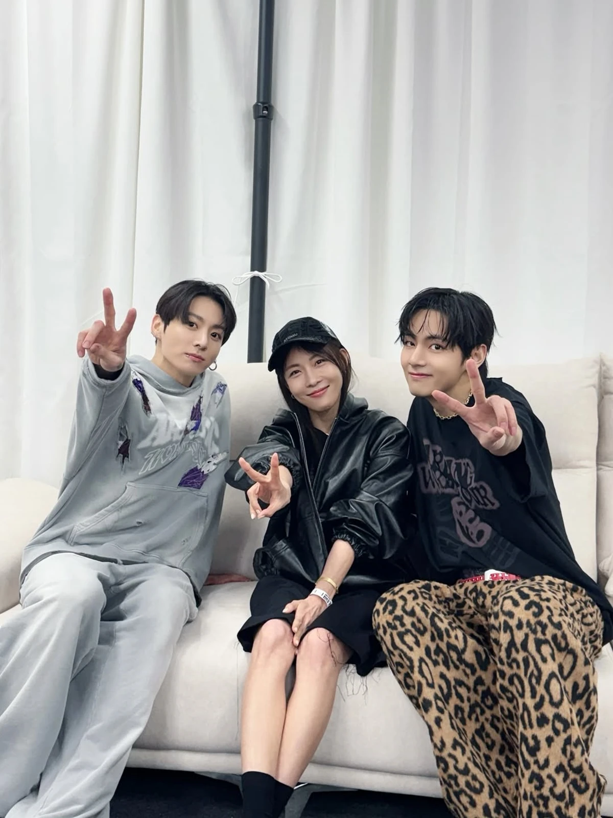 공개된 사진에서는 대기실로 보이는 장소에서 BTS 멤버 뷔, 정국과 함께 브이 포즈를 지은 채 다정하게 사진을 찍는 하지원의 모습이 눈길을 끌었다.