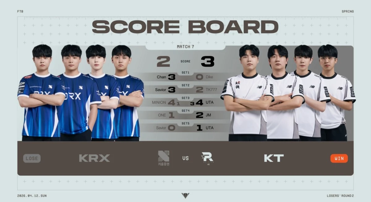 이번 경기에 패한 KRX는 아쉽게도 국제 대회를 향한 여정을 마무리하게 됐고, KT는 패자조 2라운드 BNK 피어엑스(BFX) 대 농심 레드포스(NS)의 승자와 패자조 3라운드에서 만나게 됐다.