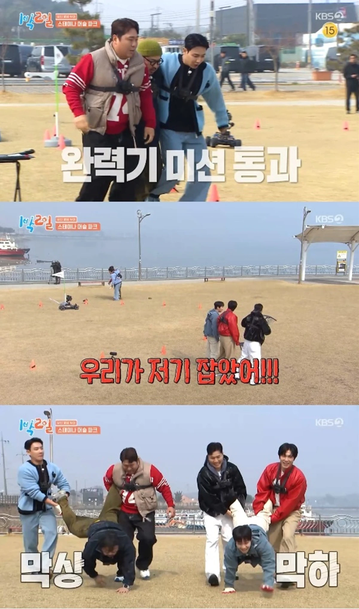 두 팀은 발이 묶인 상태로 완력기, 단체 줄넘기, 버피 테스트, 평균대 구간을 거치면서 상대 팀에게 잡히지 않아야 했다.