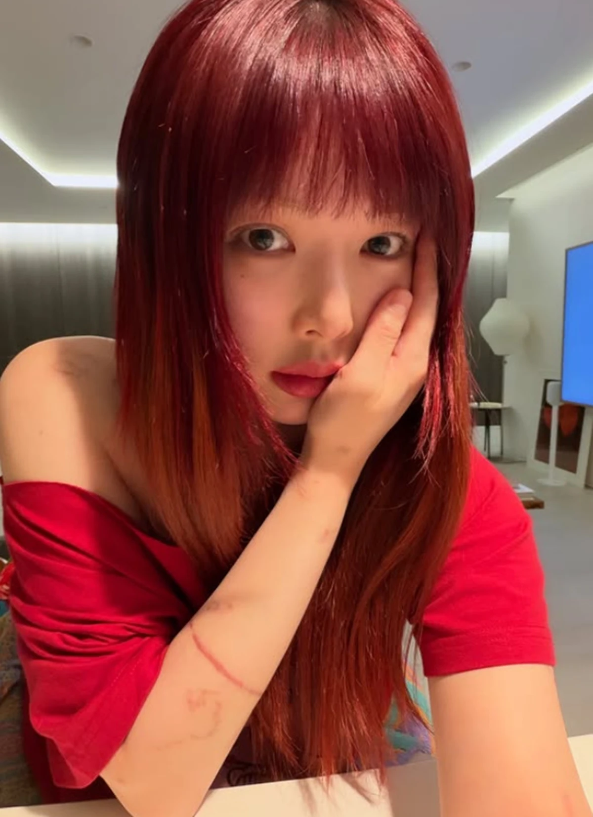 또 다른 사진에서는 강렬한 레드 헤어 스타일로 변신한 모습도 공개했다. 얼굴을 손으로 괴고 카메라를 응시하며 몽환적인 분위기를 자아냈다.