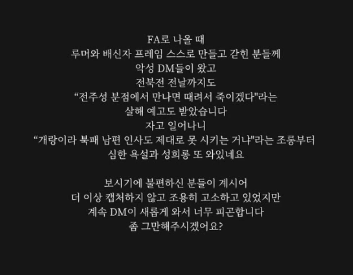 곽민선은 "FA로 나올 때 루머와 배신자 프레임 스스로 만들고 갇힌 분들께 악성 DM들이 왔고 전북전 전날까지도 '전주성 분점에서 만나면 때려서 죽이겠다'라는 살해 예고도 받았습니다"라고 전했다.