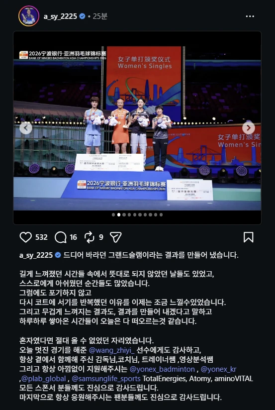이어 "항상 곁에서 함께해 주신 감독님, 코치님, 트레이너쌤(선생님) ,영상분석쌤"이라고 말한 뒤 요넥스, 르피랩, 삼성생명 스포츠단 등 스폰서들에게도 감사를 전했다.