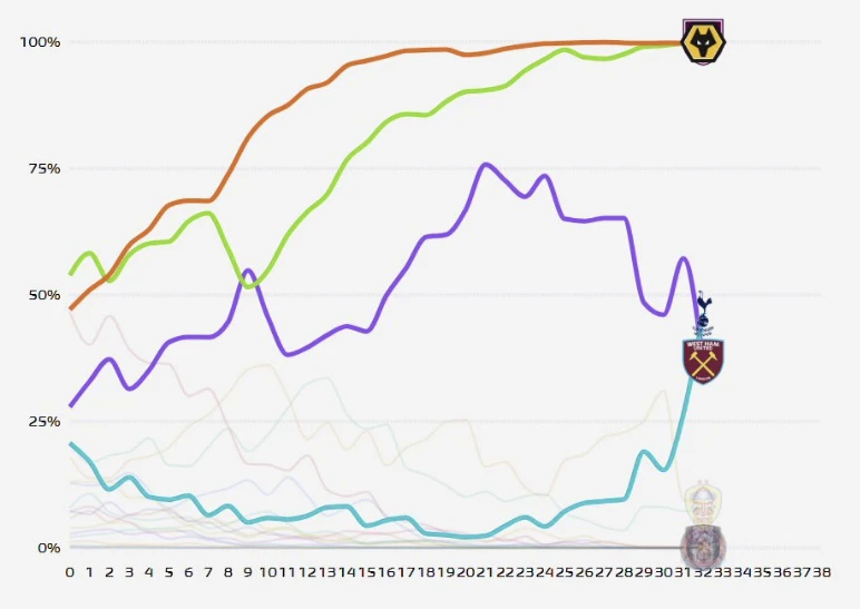 매체에 따르면 최하위 울버햄프턴의 강등 확률이 100%이며, 번리가 99.9%다. 매체는 두 팀에 대해 강등될 것이라고 확신한 것이다.