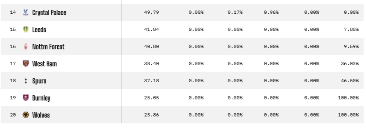 13일 오후 3시 30분 기준, 슈퍼컴퓨터가 예측한 프리미어리그 순위 예측에서 토트넘 홋스퍼가 기대 승점 37.18점으로 38.48점을 받은 웨스트햄 유나이티드에 밀려 18위로 강등될 것으로 예측됐다.