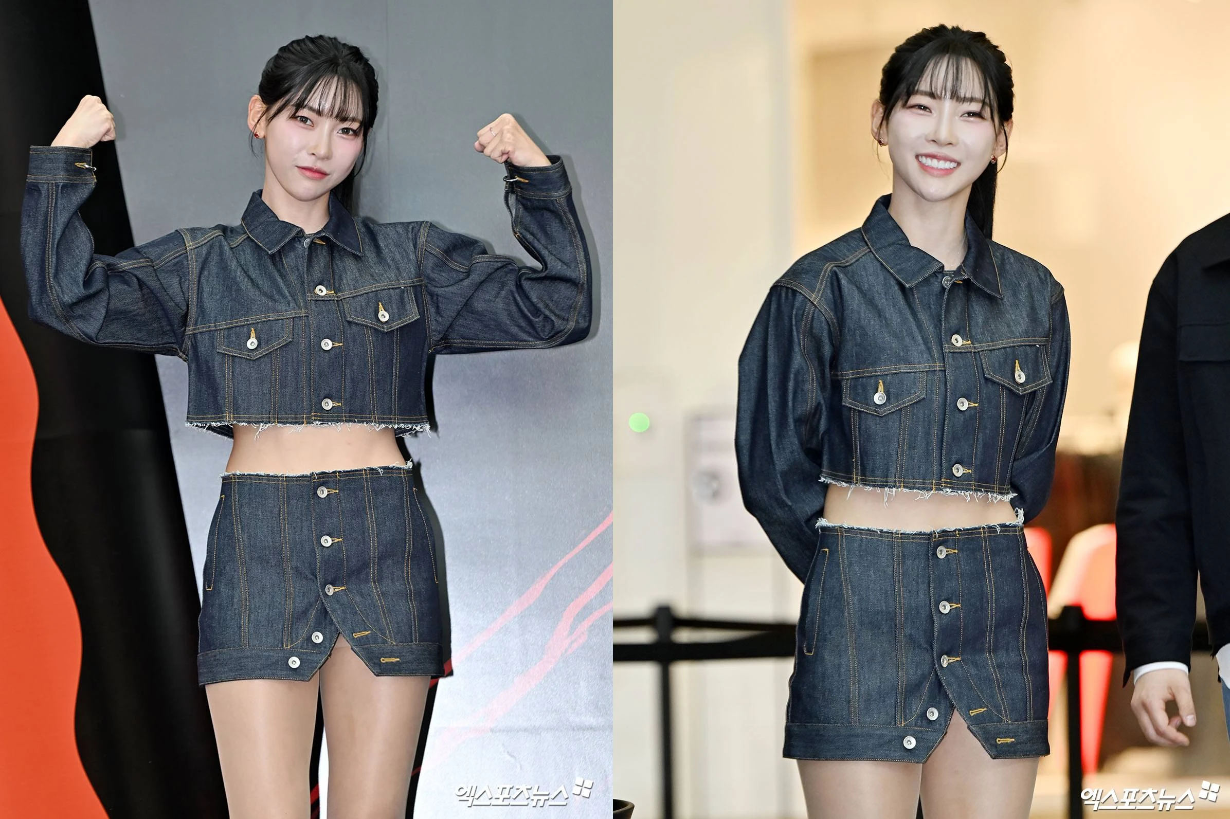 이날 김민지는 데님 셋업 스타일링으로 등장해 눈길을 끌었다. 크롭 기장의 재킷과 미니스커트를 매치한 그는 잘록한 허리 라인과 군살 없는 복근을 드러내며 건강미 넘치는 매력을 발산했다.