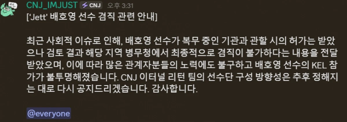 선수단 측 입장을 총괄 대변하는 님블뉴런의 설명에 따르면, '제트'의 경우 지난 3월 17일 관할 지자체로부터 정상적으로 겸직 허가를 받았다. 그러나 약 3주 뒤 병무청이 해당 건을 재검토한 끝에 불가 통보를 내렸다는 것이 팀 측 설명이다. 지자체장은 허가했으나 병무청 본청 지침에 따라 행정이 번복된 셈이다. 같은 기간 '서그남', '위드', '지워크' 역시 비슷한 상황에 놓였다.