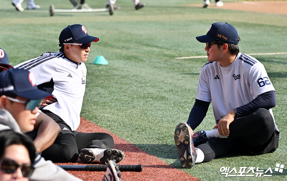 (엑스포츠뉴스 인천, 김한준 기자) 14일 오후 인천SSG랜더스필드에서 열리는 '2026 신한 SOL Bank KBO리그' 두산 베어스와 SSG 랜더스의 경기, 두산 손아섭이 안재석과 대화를 나누고 있다.